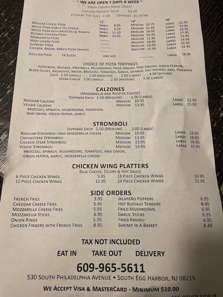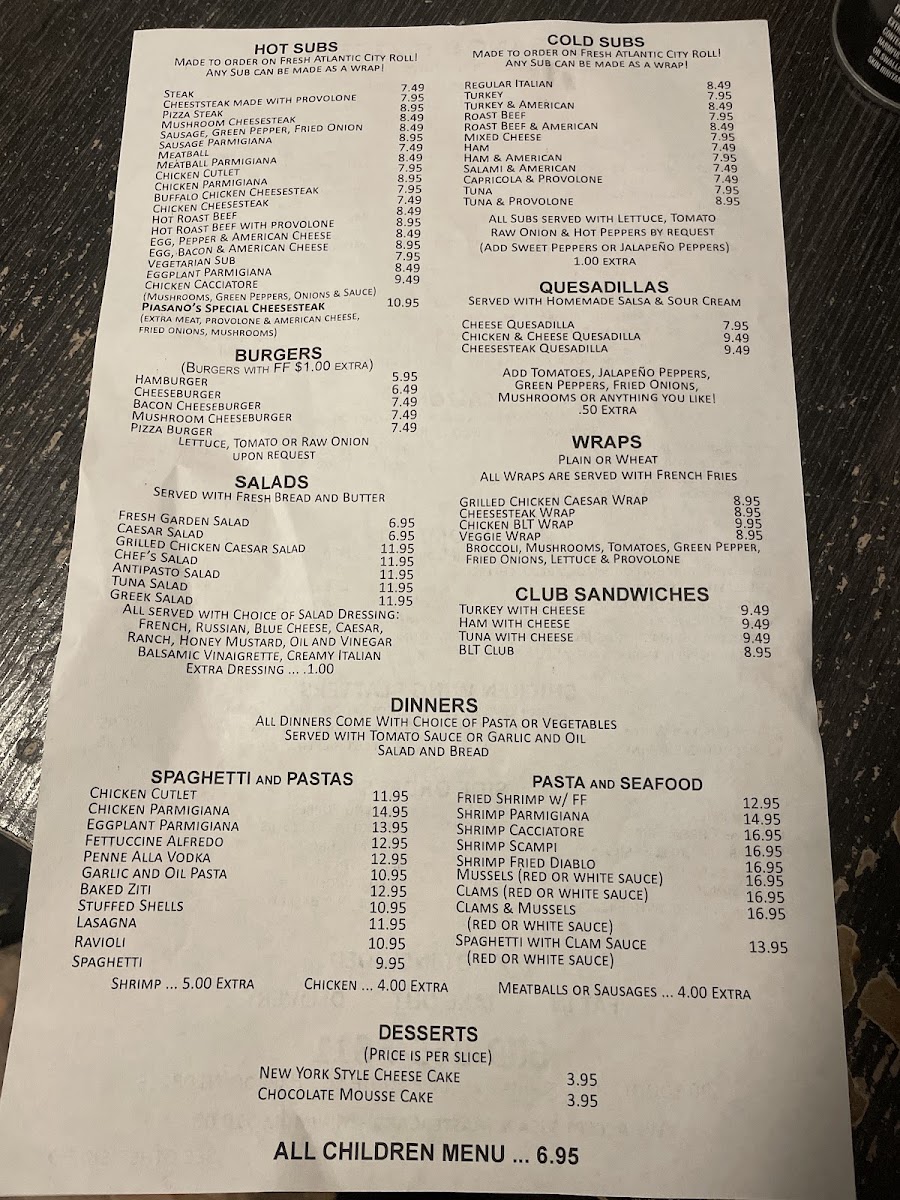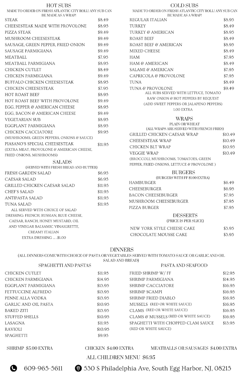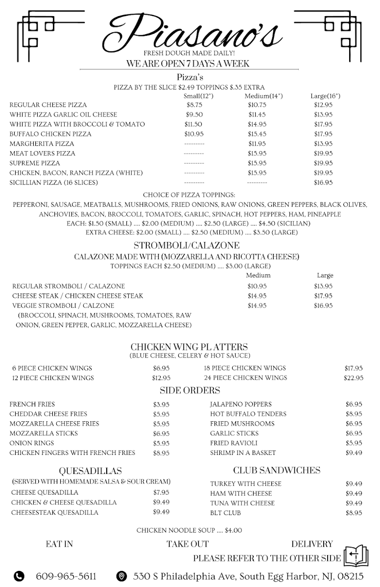 If you're craving delicious, freshly made pizza in Egg Harbor City, the Piasano's Pizzeria Menu is sure to satisfy your taste buds. Located on Philadelphia Avenue, this cozy spot serves up a variety of mouth-watering pizzas, each crafted with the finest ingredients. Whether you’re in the mood for a classic cheese pizza or a specialty pie loaded with toppings, there’s something for everyone.
